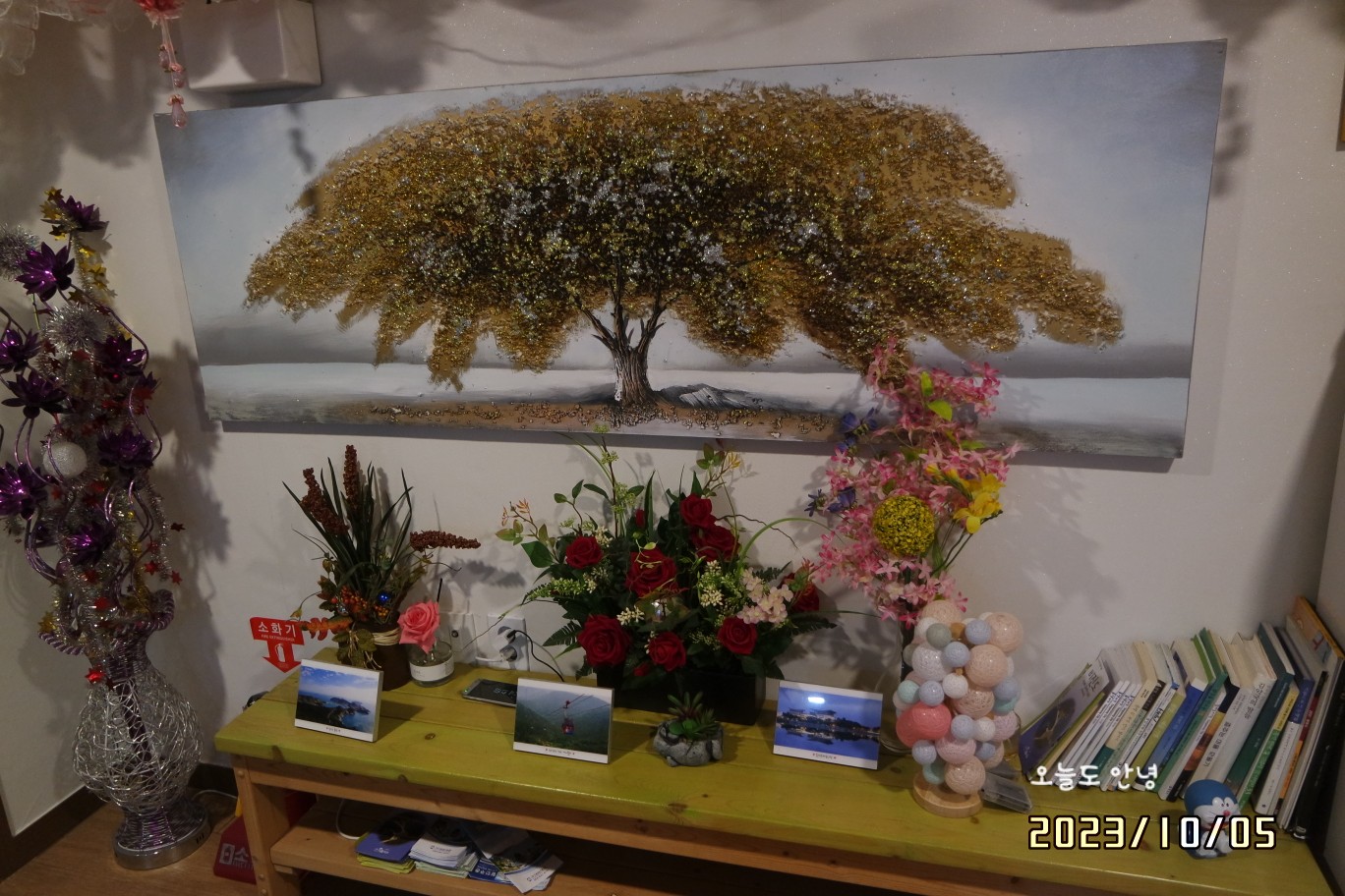 여행이야기가 가득한 책과 사진들이 있고, 행운 나무 그림이 있어요.